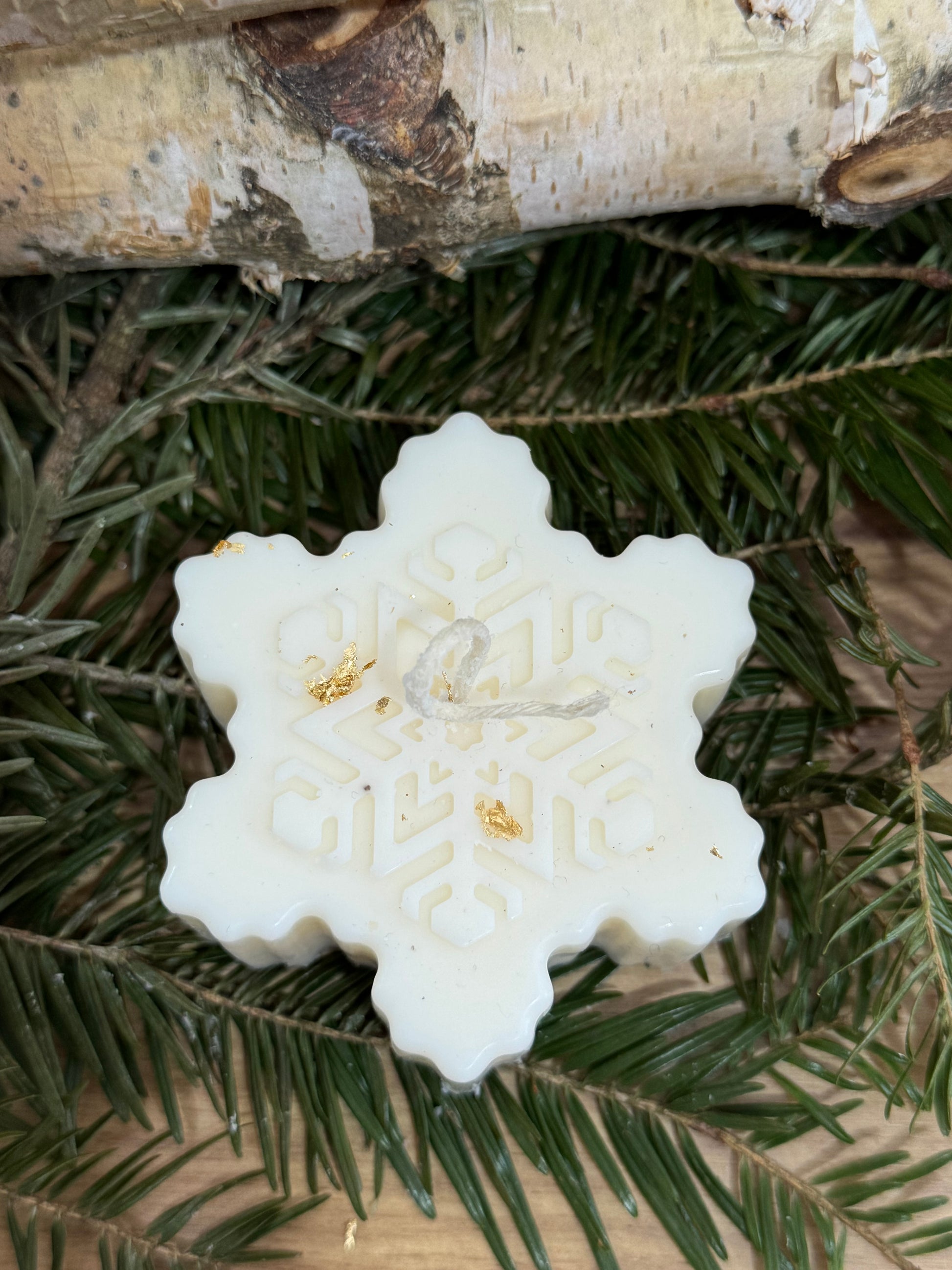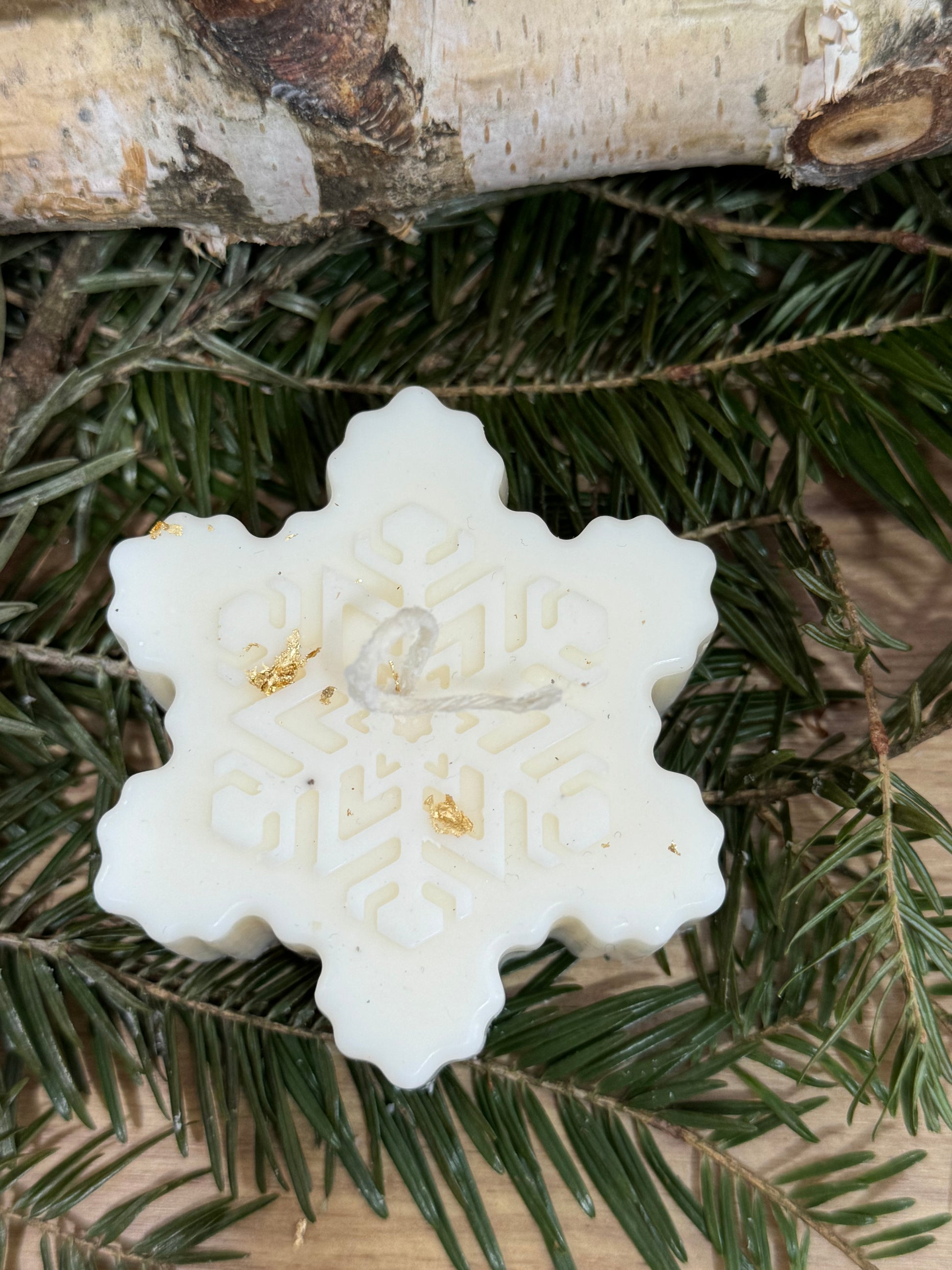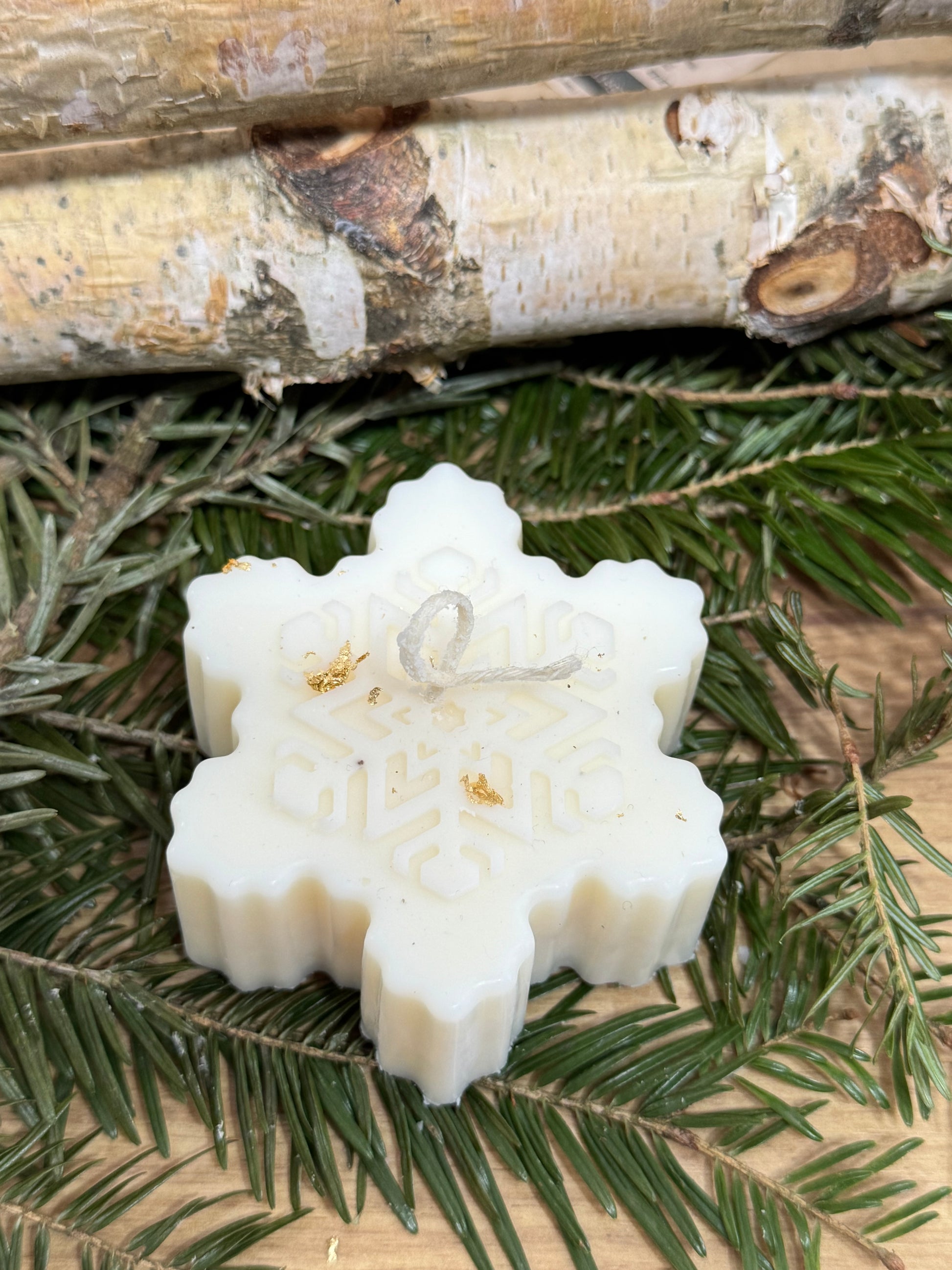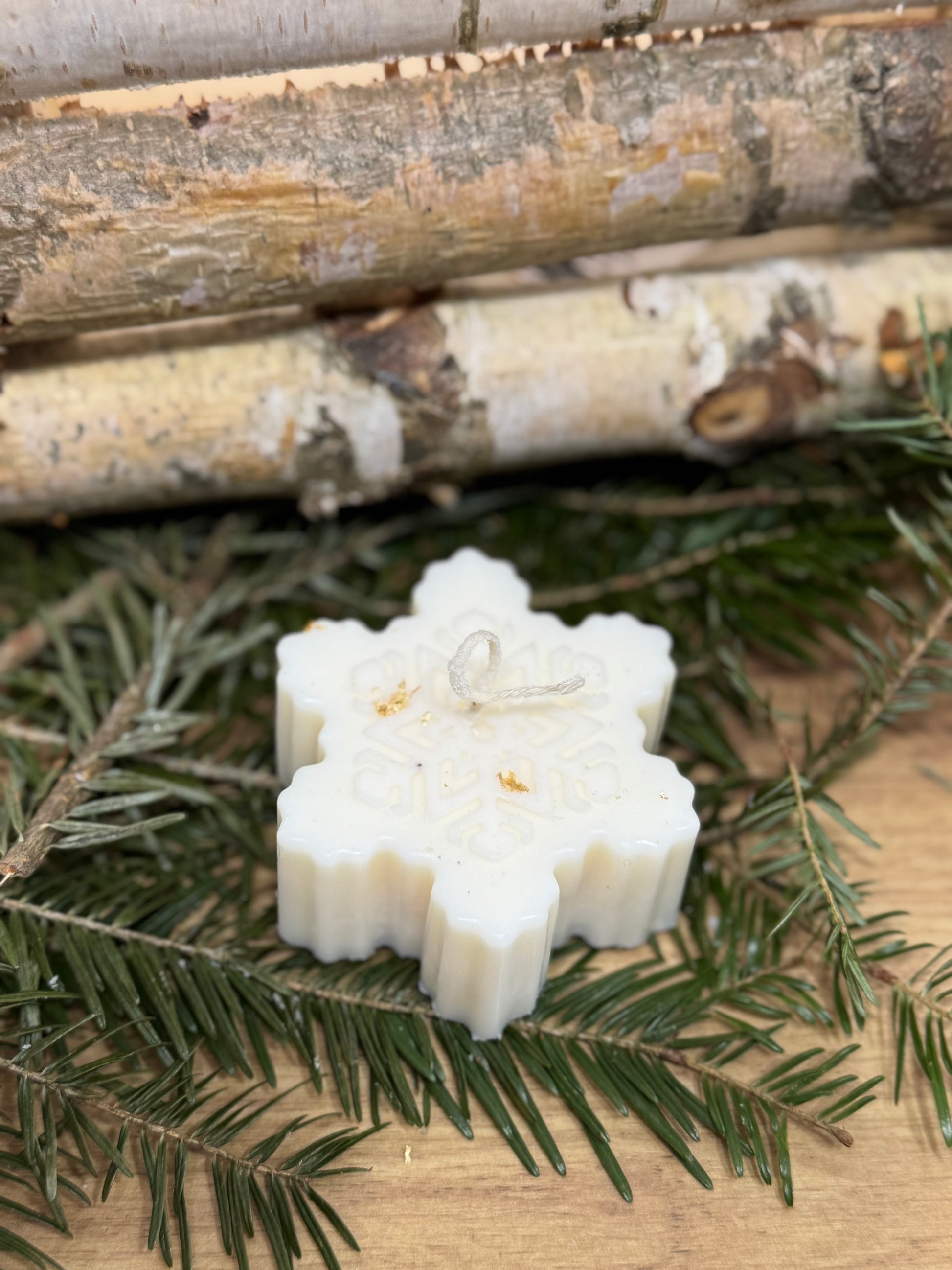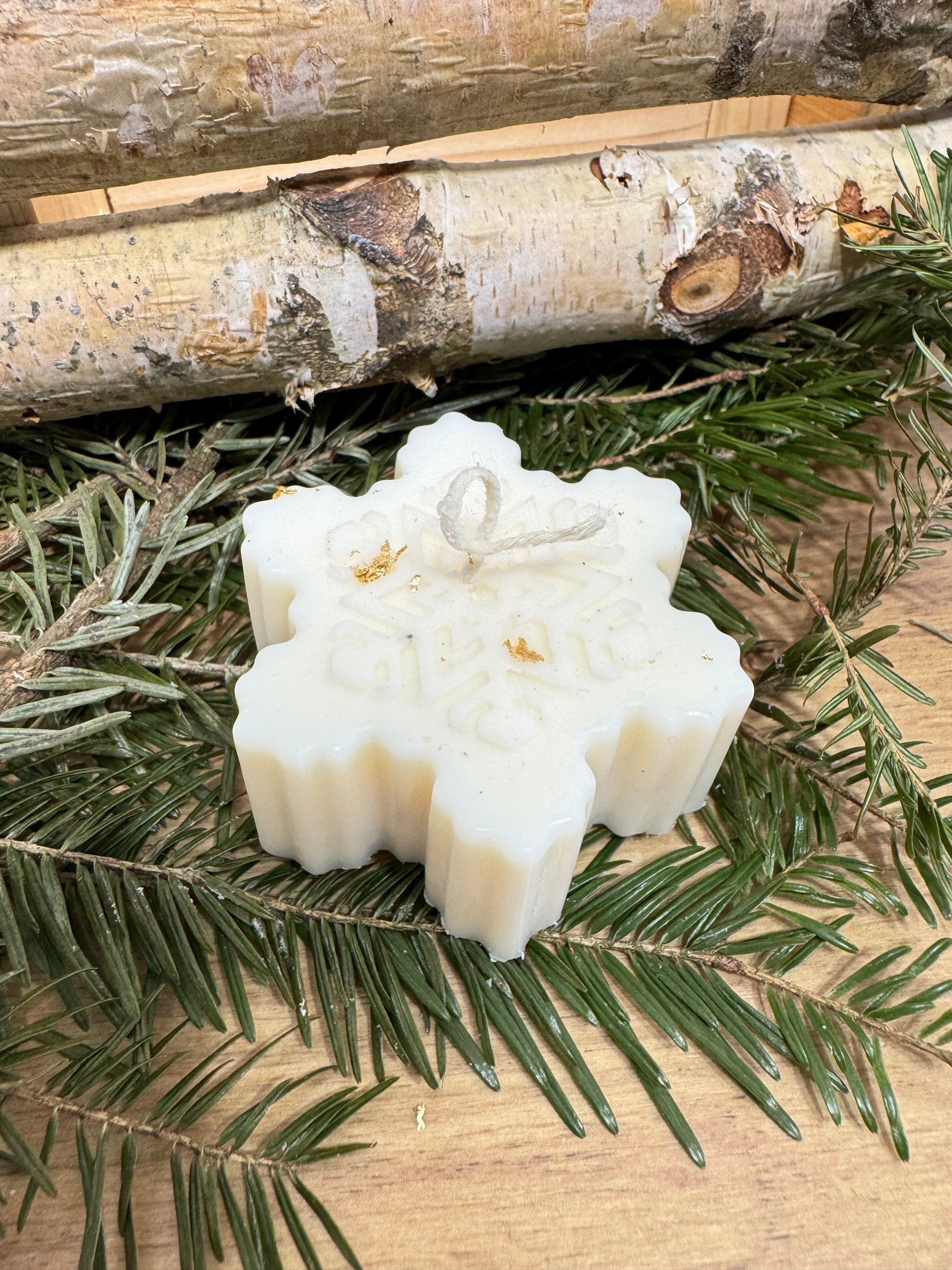 Lumânare artizanală turnată manual din ceară naturală de soia, cu un parfum proaspăt de brad care aduce liniștea pădurii de iarnă în casa ta. Designul delicat în formă de fulg de nea adaugă o notă festivă și elegantă decorului tău. Ideală pentru sezonul rece, oferă o atmosferă calmă și reconfortantă, fiind și o alegere excelentă pentru un cadou de sărbători. 100% vegană și ecologică.